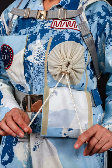 In working with the FWM Studio team, Koran’s design evolved into a practical boiler suit with compartments for essentials like baby wipes, flaps and cinches for breastfeeding access, and more. Recognizing motherhood as a form of unprotected labor and essential to the care economy, the artist also created a series of patches that play on labor union and NASA patches—the former inspired by one belonging to her grandmother. MSS (an acronym for Mama Space Suit) positions the work of motherhood as vital, brave, and worthy of our reverence.